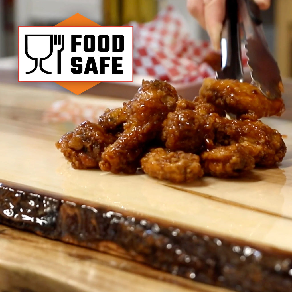 Use Industrial Clear to coat serving trays, charcuterie boards, bar tops, counters or anything else that is intended for contact with food.  We don’t recommend using it on any cutting surface (like a cutting board) as the surface will scratch. If scratching occurs, simply sand down the entire surface and pour a fresh top coat of clear resin to restore the finish.